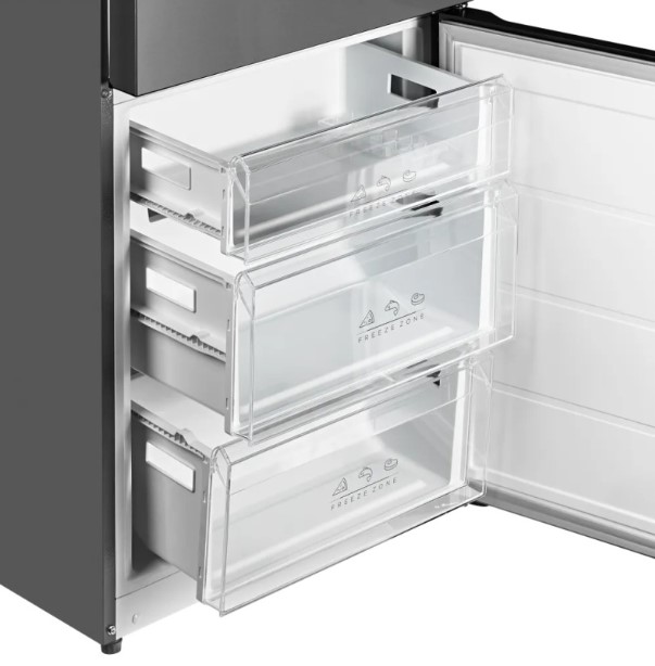 Трехкамерные модели выпускаются в нескольких вариантах. В некоторых случаях в качестве третьей камеры поступает так называемая зона свежести — отделение, где поддерживается температура около 0 градусов. В другом варианте подобные модели имеют морозильную камеру, состоящую из двух выдвижных ящиков.