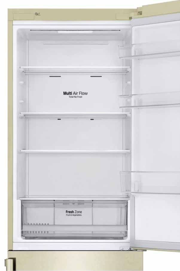 Специальная зона свежести предназначена для правильного и более длительного хранения овощей, фруктов, зелени. В ней поддерживается околонулевая температура, поэтому продукты не перемораживаются и не пересыхают. Система охлаждения этого холодильника — Multi-Airflow-System.