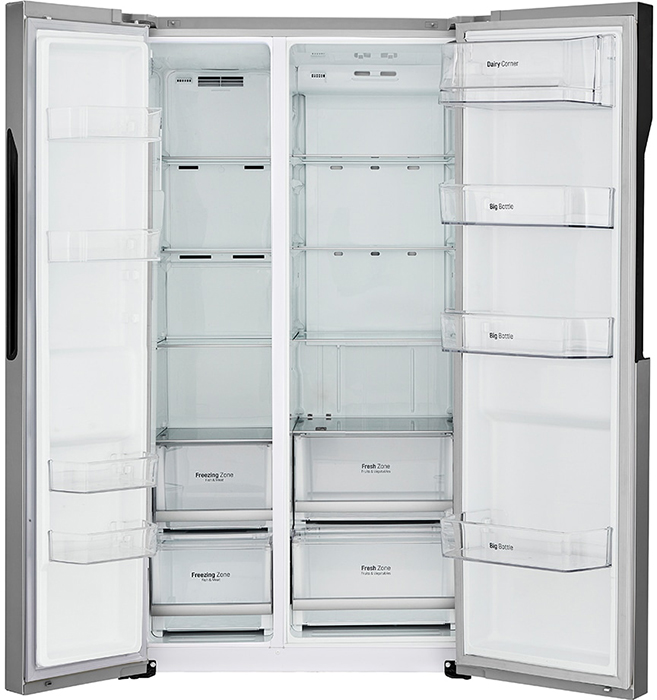 Данная модель — отдельностоящая, поэтому нужно тщательно подобрать место для ее размещения. Холодильник Side-by-Side с необычным расположением камер — сбоку друг от друга — позволяет увеличить объем продуктов для хранения. Такой вариант подходит обладателям просторной кухни, большим семьям, людям, которые запасают продукты и готовят впрок. Количество камер: 2.