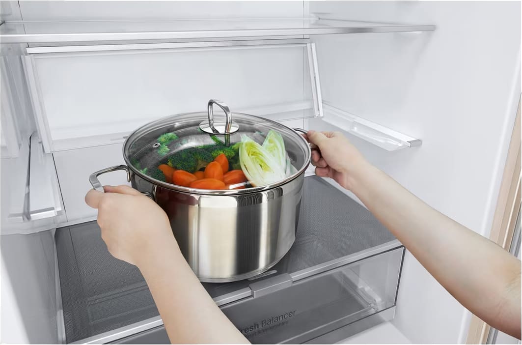 Специальная зона свежести предназначена для правильного и более длительного хранения овощей, фруктов, зелени. В ней поддерживается околонулевая температура, поэтому продукты не перемораживаются и не пересыхают. Система охлаждения этого холодильника — Multi-Airflow-System.