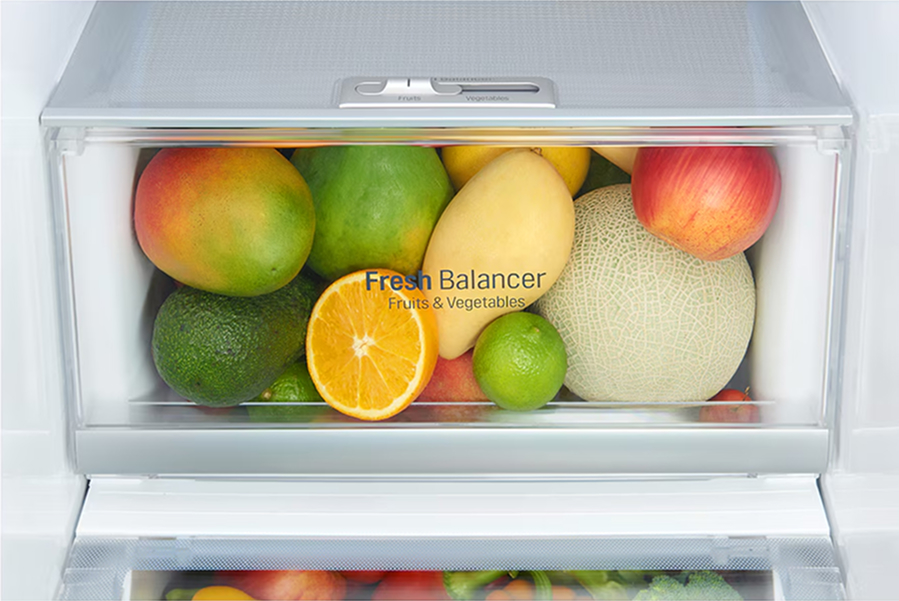 Вместительные контейнеры позволяют хранить достаточное количество овощей и фруктов. Для более длительного хранения и поддержания свежести овощей и фруктов разработаны специальные системы хранения. Среди них, например, зона свежести с увеличенной влажностью до 85% и температурой около 0 градусов. Это герметично закрывающийся ящик, часто на выдвижных роликах или направляющих, в котором имеется специальное задвижка, позволяющая регулировать влажность. Как известно, при более высокой влажности продукты с большим содержанием воды дольше остаются свежими.