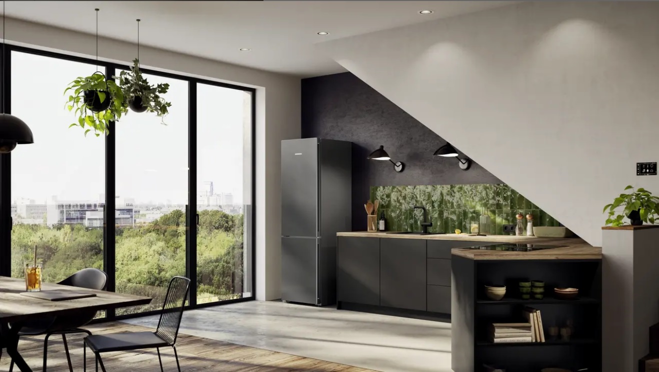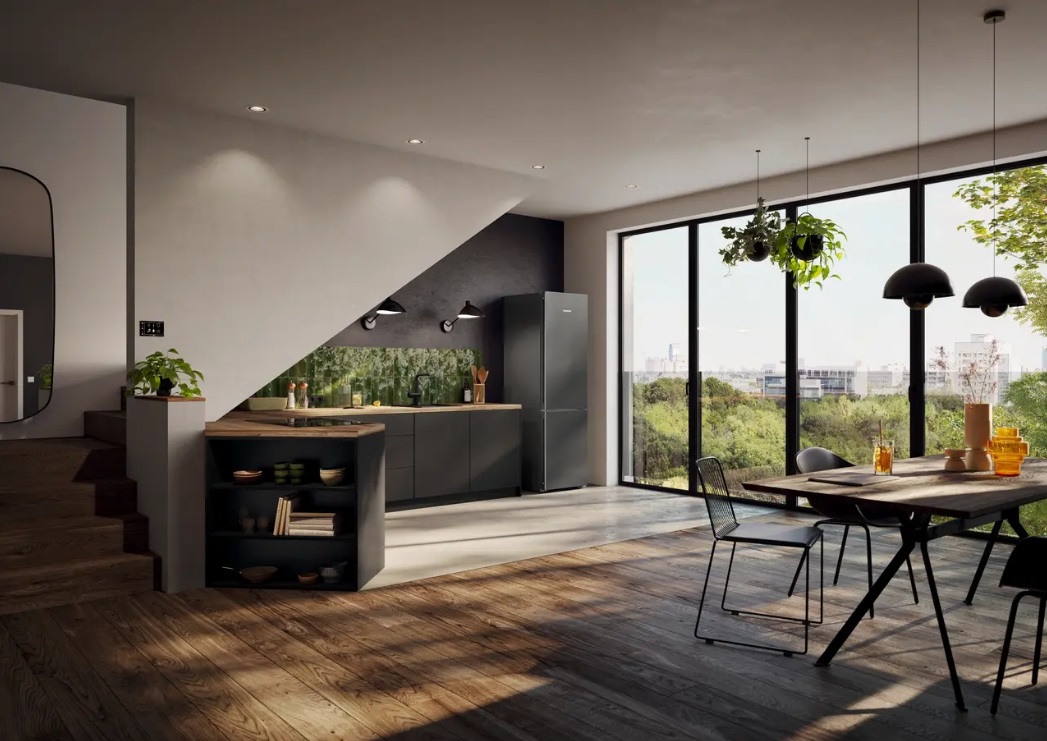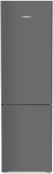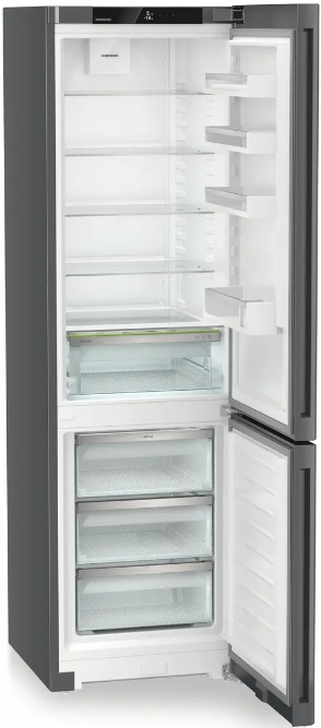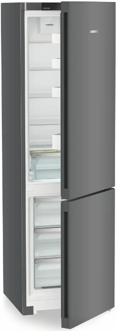 Отдельно стоящий холодильник с нижним морозильным отсеком выполнен в темно-сером металле: фронт и боковины из стали придают прочности. Вертикальные интегрированные ручки подчеркивают силуэт, а доводчик закрывает дверь мягко и бесшумно. Формат InteriorFit и вентиляция через лицевую панель упрощают установку в нишу. Две двери с правым упором (есть перевешивание) и угол открытия 115° удобны на кухне любой планировки.