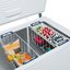 Внутренняя камера морозильного ларя, как правило, не содержит полок, ящиков и других подобных разделителей — это большой цельный отсек, в котором сверху могут крепиться металлические сетчатые корзины. Такая конструкция позволяет максимально увеличить вместительность устройства.