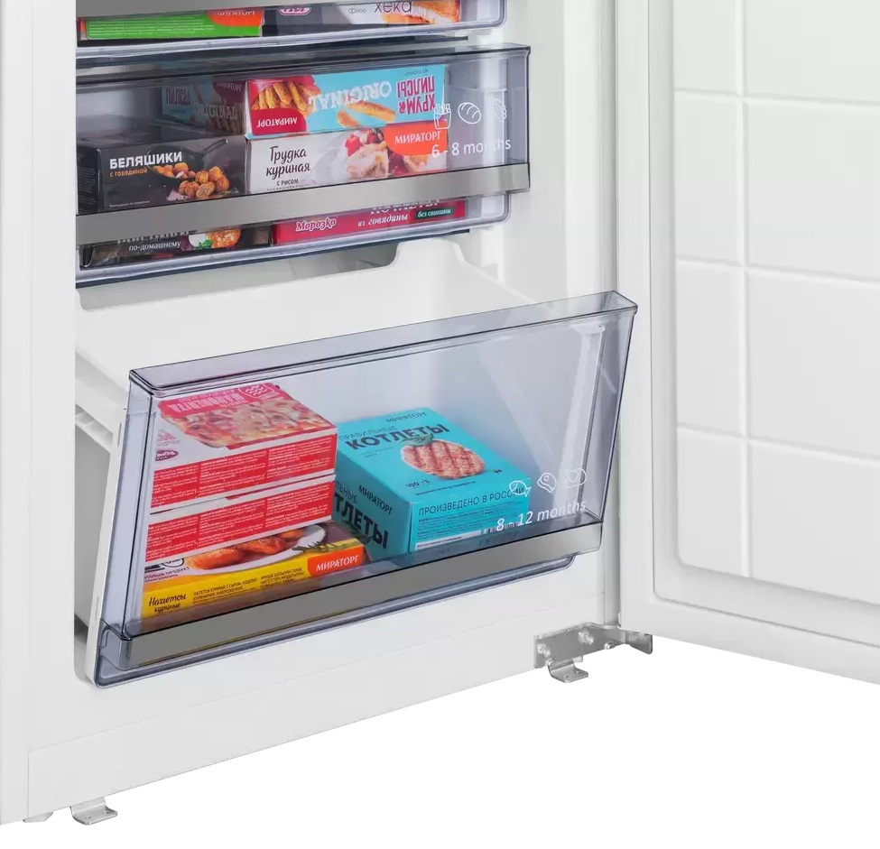 Встраиваемый прибор проще разместить в комнате, даже если общий метраж не такой уж большой. Вы можете спрятать его за декоративной панелью от мебельного фасада — советуем заранее определить нишу и заказывать панели исходя из типа крепления к двери. Способ монтажа в данной модели: жесткое крепление (система door on door) Благодаря внушительным размерам, в частности высоте, она подходит большим пространствам — просторной кухне, еврогостиной. Вы можете поменять направление открывания двери, так как упор переставляемый и ее можно перевесить на другую сторону. Такая функция открывает больше возможностей для установки. Холодильник с морозильником обладает всеми опциями, которые чаще всего ищут и выбирают покупатели. Стандартная конфигурация — универсальный вариант для любой квартиры. Количество камер: 2.