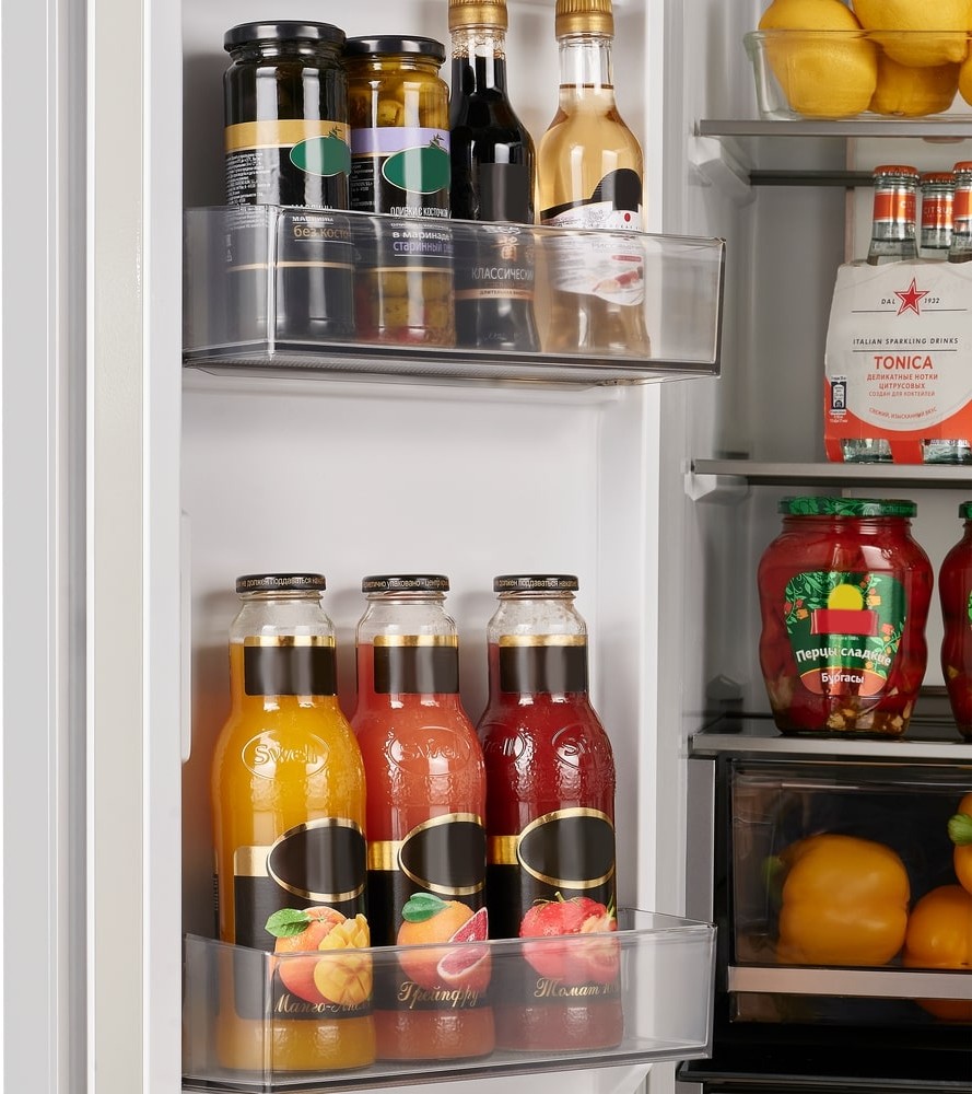 Полки в холодильнике позволяют рационально организовать хранение продуктов, обеспечить легкий поиск и доступ к ним. Основные материалы для изготовления полок — это пластик, стекло и металл. Часть полок можно переставлять по высоте или складывать вдвое или втрое.