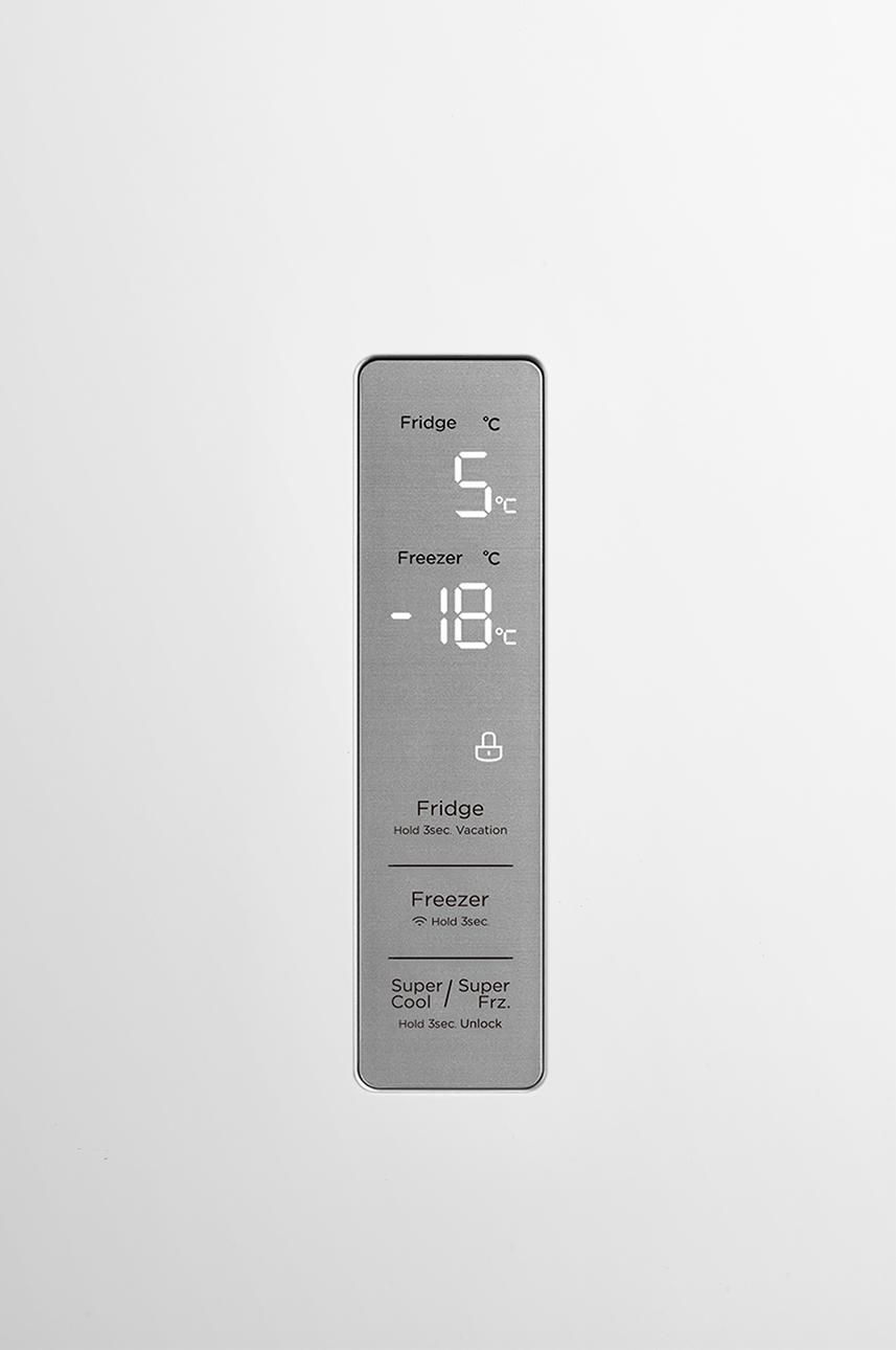 Гораздо точнее сориентироваться по индикаторам можно в холодильниках с электронной системой управления. Эти устройства обычно оснащены дисплеем, на котором высвечиваются значения фактической температуры в холодильной и морозильной камерах. Рядом с ними располагаются кнопки, во многих случаях сенсорные, при помощи которых можно регулировать температуру в каждой камере отдельно, и индикаторы включения этих камер. Здесь же, на панели инструментов, находятся индикаторы, указывающие на активацию дополнительных опций — например, режимов быстрого замораживания и быстрого охлаждения, отпускного режима, блокировки панели управления от детей.