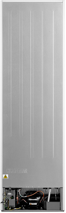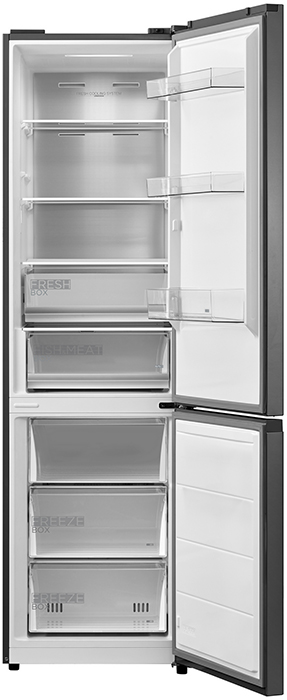 Модель представляет собой двухкамерное устройство с нижним расположением морозильного отделения — продуманная конфигурация, при которой повседневные продукты находятся на уровне глаз в холодильной зоне, а замороженные запасы — внизу, где они меньше подвержены перепадам температуры при частом открывании дверцы. Две двери обеспечивают чёткое разделение зон, упрощая доступ и поддержание порядка внутри.