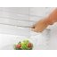 В холодильном отделении имеются четыре регулируемые по высоте полки, подвесная полка для бутылок, контейнер для хранения масла. Система DynaCool равномерно распределяет холодный воздух, так что продукты можно хранить в любом отсеке. В зоне свежести с регулировкой влажности продукты размещаются в контейнерах не телескопических направляющих. Автоматический режим суперохлаждения служит для быстрого снижения температуры и шоковой заморозки загруженных продуктов. На дверце располагаются переставляемые по высоте рамки VarioBord со съемными пластиковыми полочками.