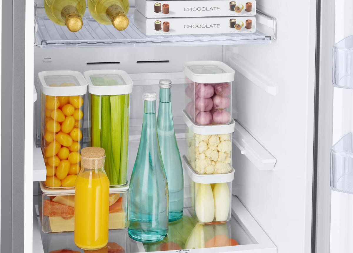 Вместительные контейнеры позволяют хранить достаточное количество овощей и фруктов. Для более длительного хранения и поддержания свежести овощей и фруктов разработаны специальные системы хранения. Среди них, например, зона свежести с увеличенной влажностью до 85% и температурой около 0 градусов. Это герметично закрывающийся ящик, часто на выдвижных роликах или направляющих, в котором имеется специальное задвижка, позволяющая регулировать влажность. Как известно, при более высокой влажности продукты с большим содержанием воды дольше остаются свежими.