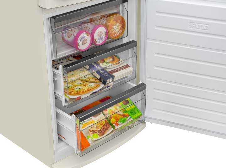 Трехкамерные модели выпускаются в нескольких вариантах. В некоторых случаях в качестве третьей камеры поступает так называемая зона свежести — отделение, где поддерживается температура около 0 градусов. В другом варианте подобные модели имеют морозильную камеру, состоящую из двух выдвижных ящиков.