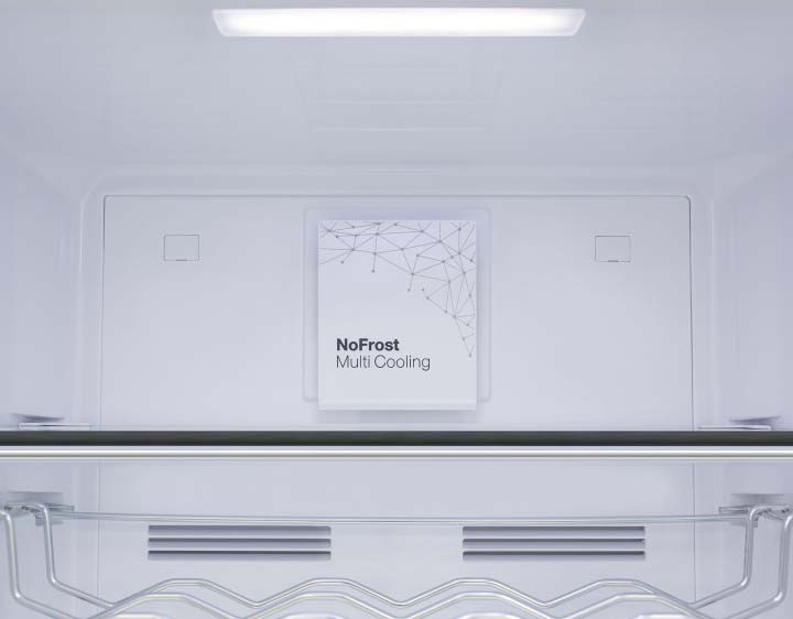 No Frost (Total No Frost, Frost Free): вентилятор обеспечивает циркуляцию охлажденного воздуха, благодаря чему лед не нарастает на стенке, а концентрируется только на скрытом внутри холодильника испарителе. Талая вода собирается в специальной емкости и испаряется. Такой холодильник не нужно размораживать – это экономит время и позволяет не останавливать прибор. Благодаря этим плюсам в современных моделях No Frost – самая распространенная система.