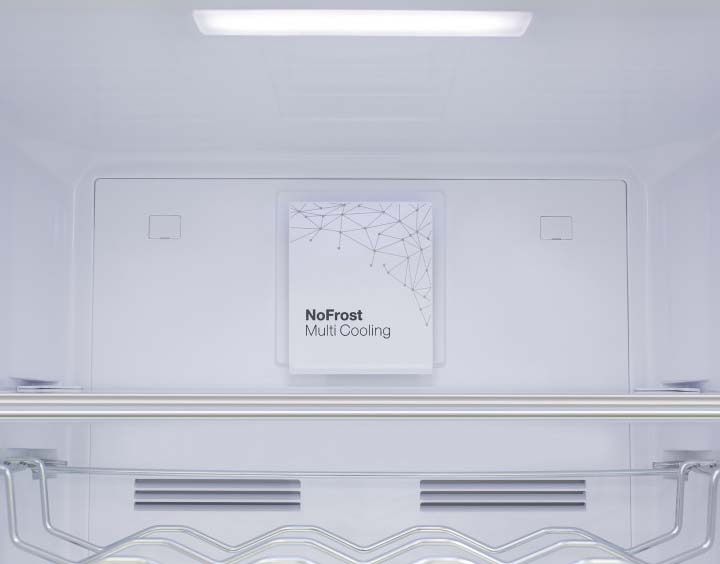 No Frost (Total No Frost, Frost Free): вентилятор обеспечивает циркуляцию охлажденного воздуха, благодаря чему лед не нарастает на стенке, а концентрируется только на скрытом внутри холодильника испарителе. Талая вода собирается в специальной емкости и испаряется. Такой холодильник не нужно размораживать – это экономит время и позволяет не останавливать прибор. Благодаря этим плюсам в современных моделях No Frost – самая распространенная система.