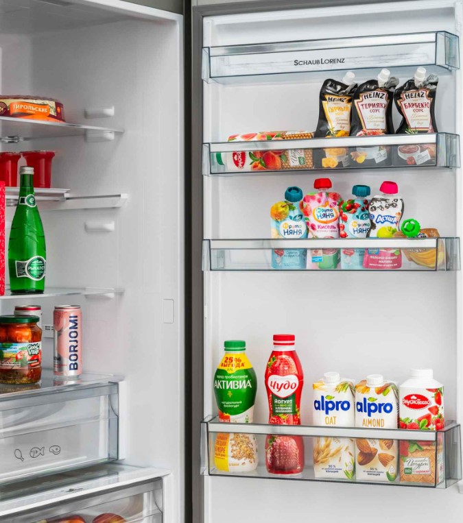 Внутреннее наполнение холодильной и морозильной камер включает многочисленные и разнообразные полки, ящики, контейнеры. Все они используются для более удобного и рационального размещения продуктов, которое обеспечивает хороший обзор содержимого холодильника и быстрый поиск.