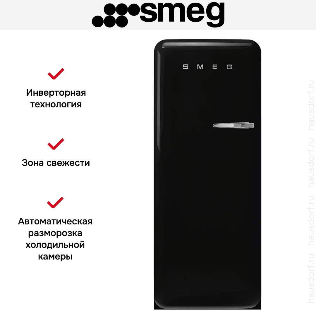 Холодильник Smeg FAB28LBL6. Как продавец-консультант отмечу, что это отдельностоящая модель с верхней морозильной камерой, выполненная в узнаваемом стиле 50-х годов и эффектном черном цвете. Внешняя ручка и левая сторона дверного упора подчеркивают винтажную эстетику, а при этом сохраняют удобство повседневного использования. Габариты 153×60.1×72.8 см делают прибор компактным вариантом для кухни средней площади, но при этом внутренняя вместимость вполне достаточна для семьи из двух-трех человек.