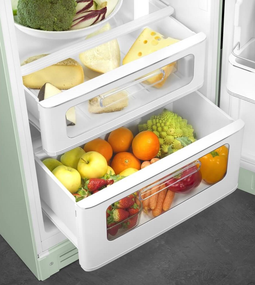Вместительные контейнеры позволяют хранить достаточное количество овощей и фруктов. Для более длительного хранения и поддержания свежести овощей и фруктов разработаны специальные системы хранения. Среди них, например, зона свежести с увеличенной влажностью до 85% и температурой около 0 градусов. Это герметично закрывающийся ящик, часто на выдвижных роликах или направляющих, в котором имеется специальное задвижка, позволяющая регулировать влажность. Как известно, при более высокой влажности продукты с большим содержанием воды дольше остаются свежими.