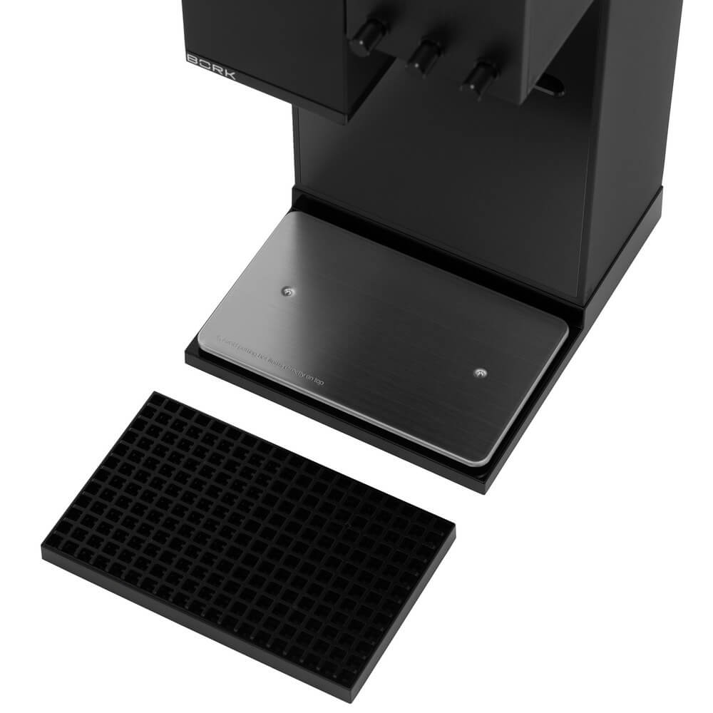 Съемный лоток для сбора капель (каплесборник) позволяет защитить столешницу от капель, которые могут попасть на нее при удалении чашки с напитком с подставки. Это плоский резервуар из пластика, который находится под решетчатой подставкой и легко выдвигается для очистки. Подсчитано, что в автоматической кофемашине в лоток попадает 15-40 мл воды за одно приготовление. Офисные модели, таким образом, должны иметь больший объем лотка, чем домашние. О заполнении этого резервуара оповещает либо специальный индикатор на панели управления, либо соответствующее сообщение на дисплее.