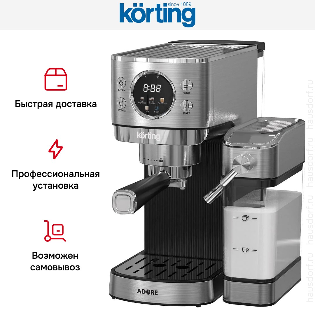 В модели Korting KCM 1006 T Adore используется молотый кофе: экспериментируйте с сырьем крупного и среднего помола, чтобы добиться идеального вкуса. Данная рожковая кофемашина предназначена в основном для приготовления эспрессо и капучино; благодаря быстрой работе и отсутствию кофейной взвеси в чашке она востребована как в быту, так и в офисах.
