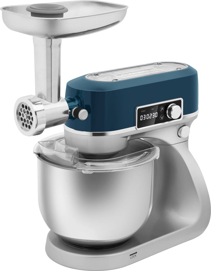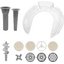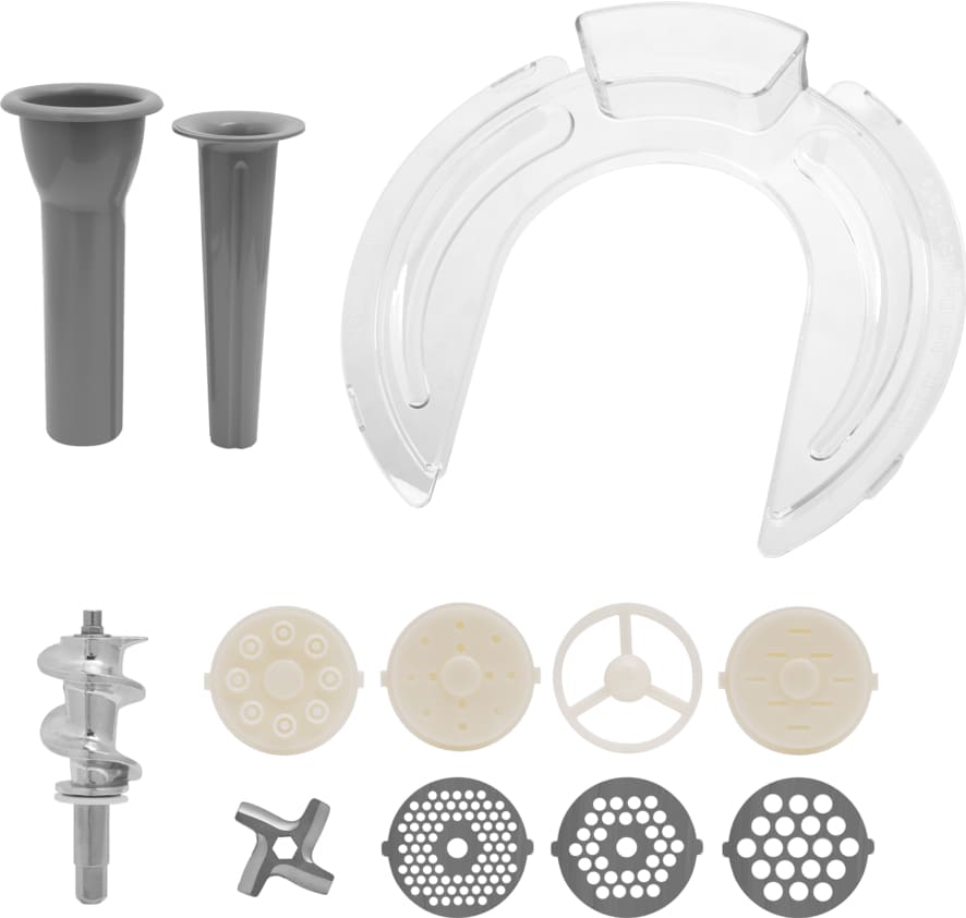 Насадки в комплекте: насадка для колбас / сосисок, 3 решетки для мясорубки, 3 решетки для лапшы, лопатка для смешивания