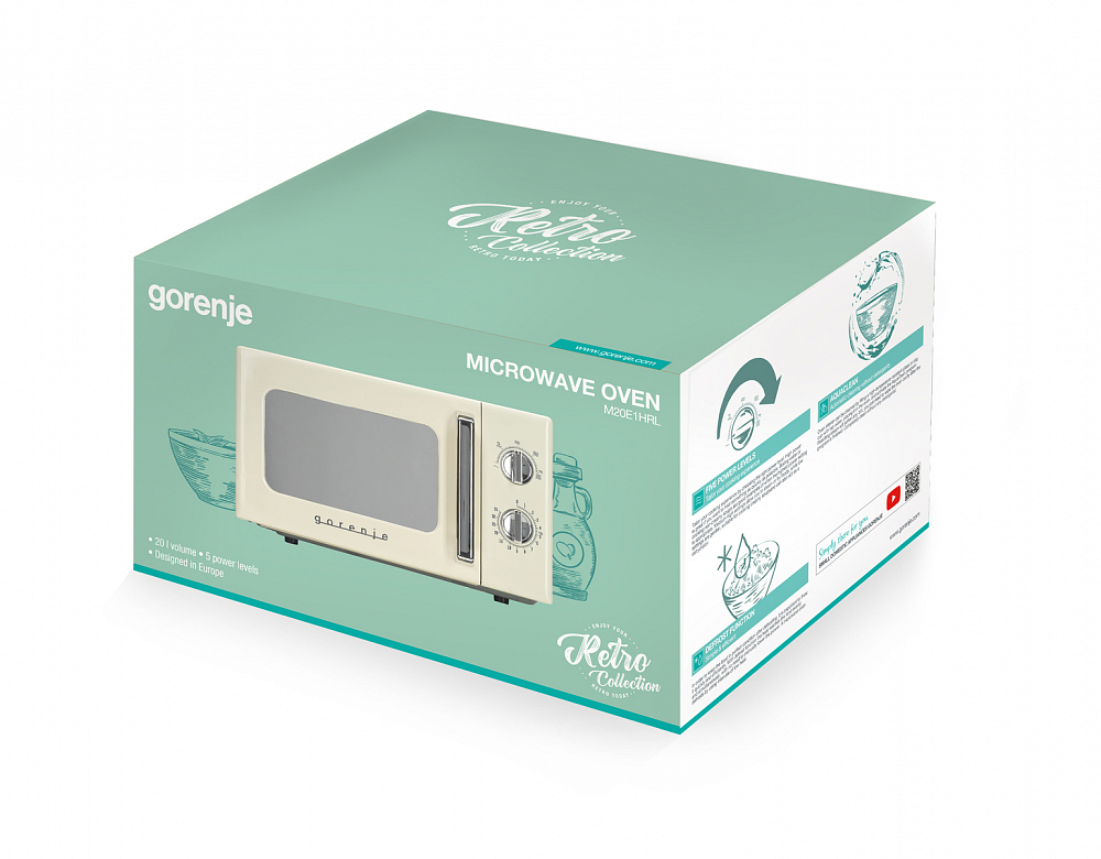 Отдельностоящая микроволновая печь Gorenje MO20E1HRL — компактное и полезное дополнение к уже имеющейся кухонной технике. Ее можно установить на шкаф, на свободную столешницу, но не рекомендуется ставить на другие приборы, например, холодильник. Цвет этой модели: бежевый. Дизайн-линейка: Retro, комбинируйте ее с другими приборами этой же серии.