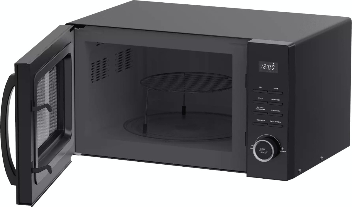 Полезный объем для готовки — 23 л. Для установки и прогрева посуды используется классическое вращающееся блюдо. В комплекте также есть решетка, с помощью которой можно разнообразить привычное меню. Понятное электронное управление не вызовет трудностей ни у кого из вашей семьи. Для изменения настроек или выбора программ используются следующие переключатели: кнопочные + поворотные.