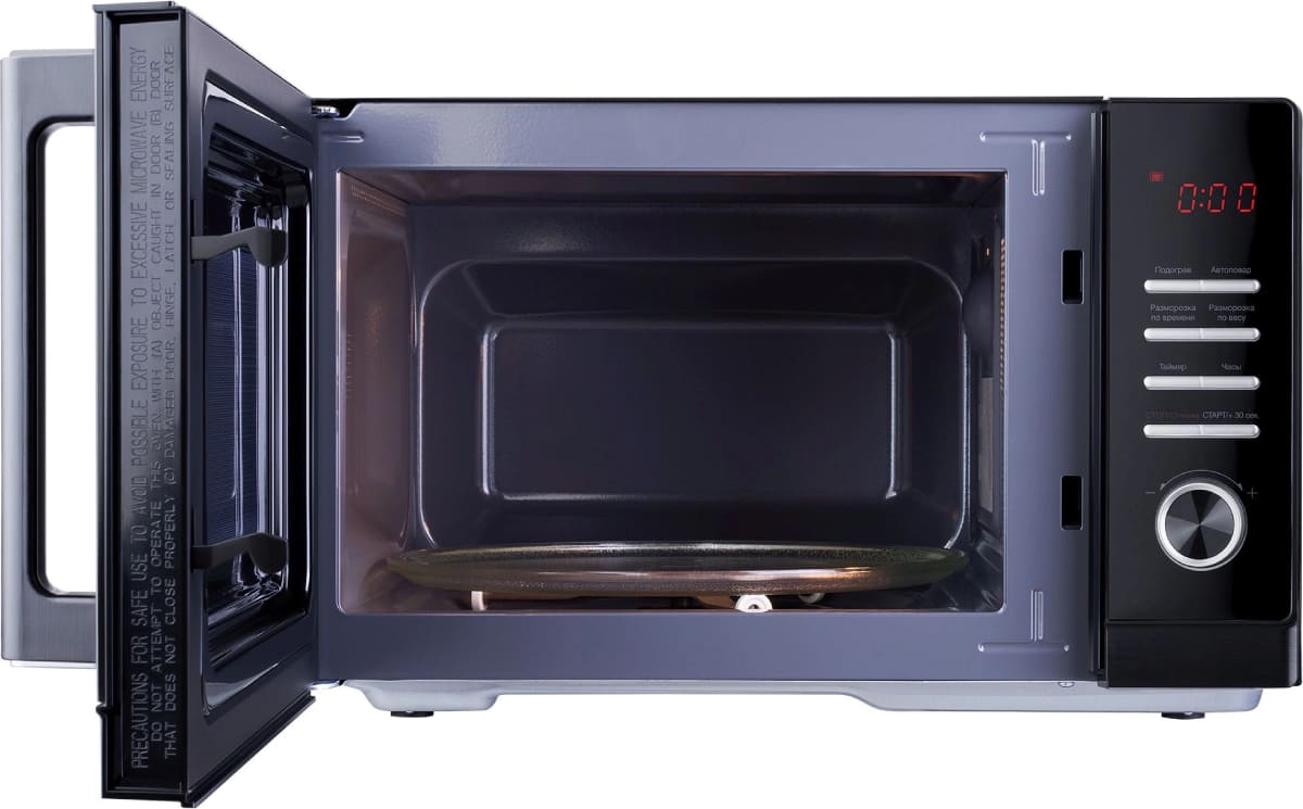Материал внутренней поверхности — эмаль. Это самое распространенное покрытие, так как оно зарекомендовало себя высоким качеством, устойчивостью к механическим воздействиям и простотой ухода. Полезный объем для готовки — 25 л. Для установки и прогрева посуды используется классическое вращающееся блюдо. Для изменения настроек или выбора программ используются следующие переключатели: кнопочные + поворотные.