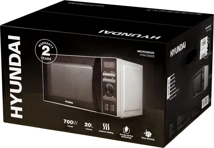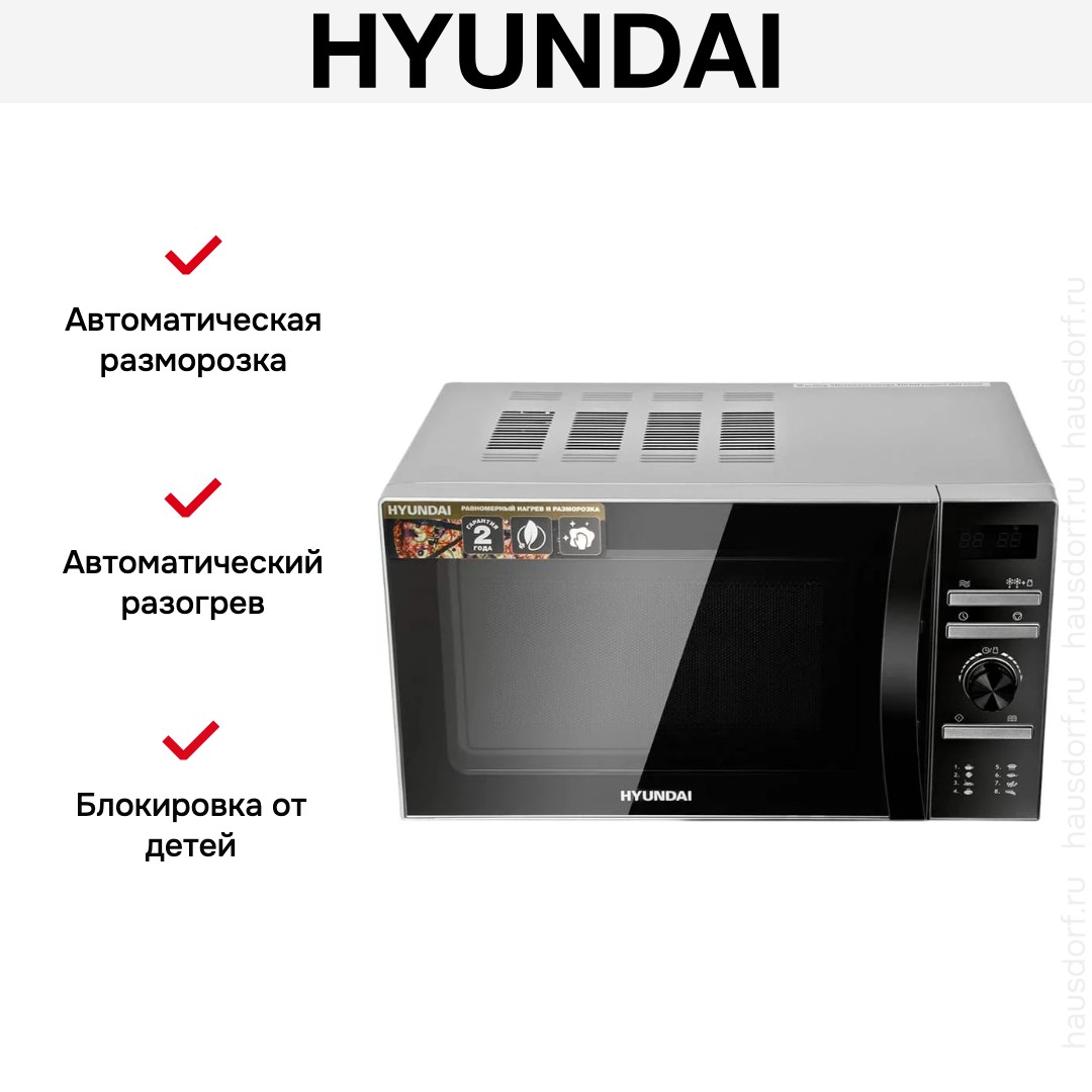 Количество режимов в данной модели Хендай: 3 шт. Для обработки продуктов и готовых блюд используются следующие виды нагрева: Микроволны, Автоматический режим разморозки, Автоматический режим приготовления. Если вы спешите, а еду нужно разогреть, используйте быстрый старт — благодаря ему 30 секунд прибор работает на полной мощности. Отдельная опция для размораживания продуктов и полуфабрикатов облегчает жизнь — не нужно самостоятельно настраивать параметры. Автоматические программы для приготовления добавлены производителем также для упрощения работы.