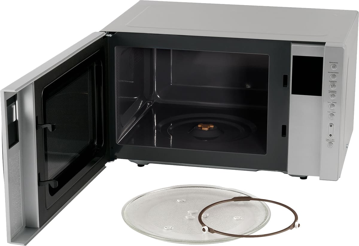 Материал внутренней поверхности — эмаль легкой очистки. Полезный объем для готовки — 23 л. Для установки и прогрева посуды используется классическое вращающееся блюдо. Для изменения настроек или выбора программ используются следующие переключатели: кнопочные.