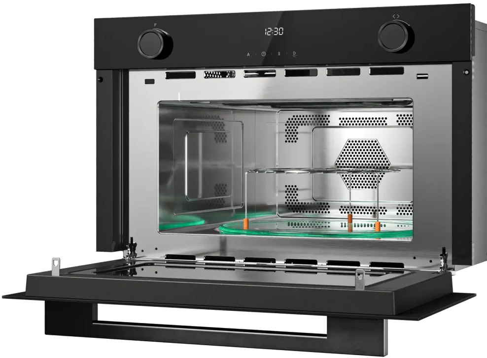 Конвекционный вентилятор устанавливается в микроволновках без поворотного стола: равномерное распределение горячего воздуха позволяет размещать в камере сразу несколько блюд. Комбинация вентилятора и верхнего гриля называется турбогрилем: этот режим очень хорош для выпечки больших пирогов и кексов. Сочетание гриля и конвекции подойдет и для приготовления больших кусков мяса или целой птицы и рыбы. Добавление традиционного нижнего нагревательного элемента превращает микроволновую печь в аналог полноценной духовки: с ее помощью можно готовить, разогревать и размораживать, запекать и томить, обжаривать и тушить.