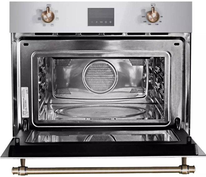 Нержавеющая сталь — быстро нагревается и хорошо переносит высокие температуры, поэтому ее используют в микроволновках с конвекцией.