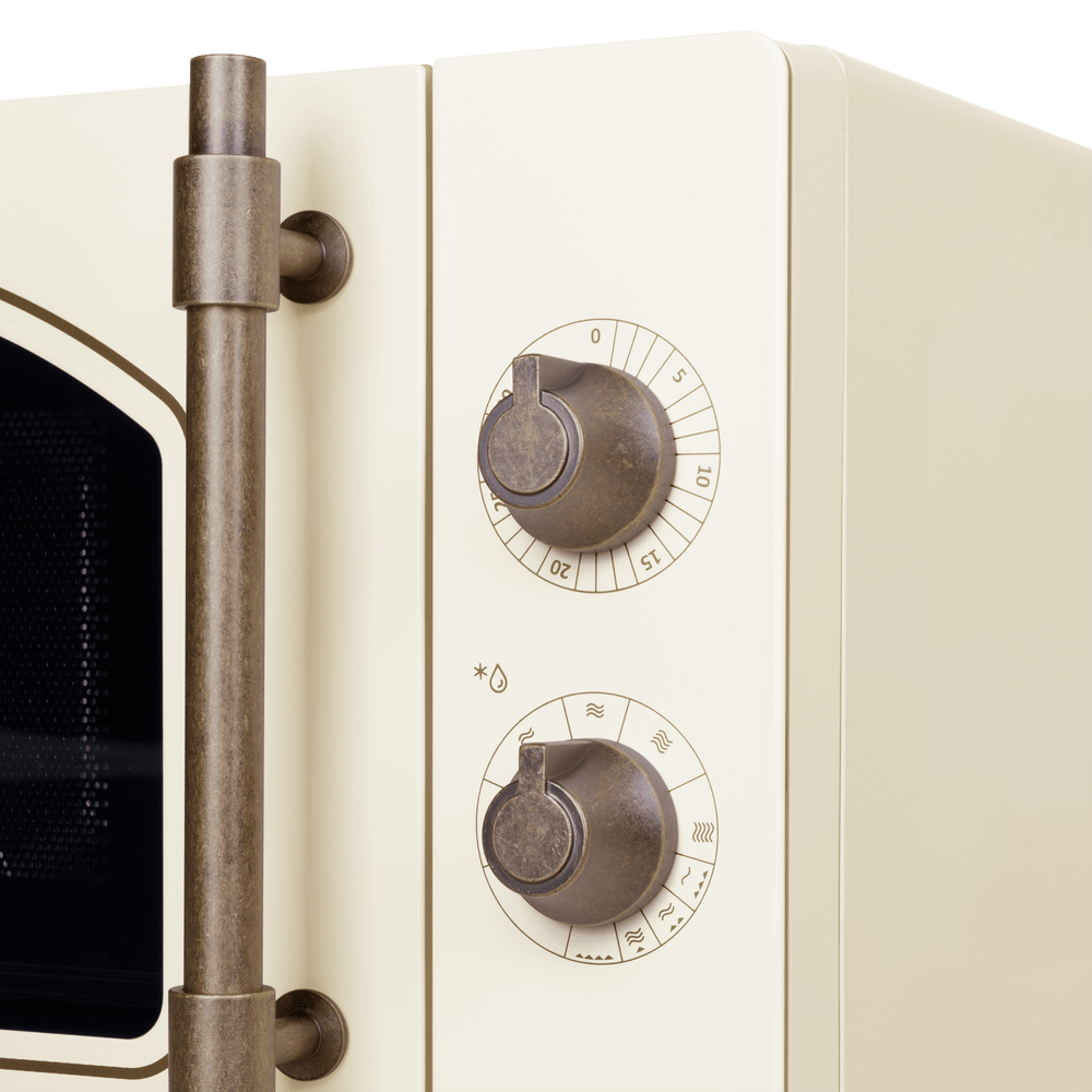 Цвет и стиль фурнитуры микроволновых печей определяется общим дизайном изделия. Большинство отдельно стоящих моделей изготавливается в современном минималистическом стиле, предусматривающем лаконичную отделку, соответствующую тону корпуса или реже контрастирующую с ним. Для этих изделий характерны ручки и поворотные переключатели белого и черного цветов, и также детали стального и серебристого оттенка. Реже производители предлагают отдельно стоящие модели в ретро, деревенском и классическом стиле с фурнитурой цвета бронзы, латуни — как, например, в печах от MAUNFELD и Gorenje.