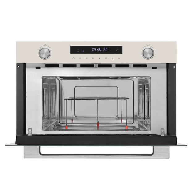 Более интересны цветовые решения для многофункциональных встраиваемых микроволновых печей. Эти приборы отличаются не только большей вместимостью, достаточно высокой ценой и широким набором возможностей, но и обширным выбором дизайнерских решений, а значит — и разнообразной по цвету фурнитурой. К ней можно отнести рукоятки поворотных переключателей, ручки-рейлинги у откидных дверей, элементы отделки. Кроме уже перечисленных оттенков, встроенные микроволновки могут оснащаться фурнитурой красного, золотого, серого цветов, а также оттенков меди и состаренного серебра.