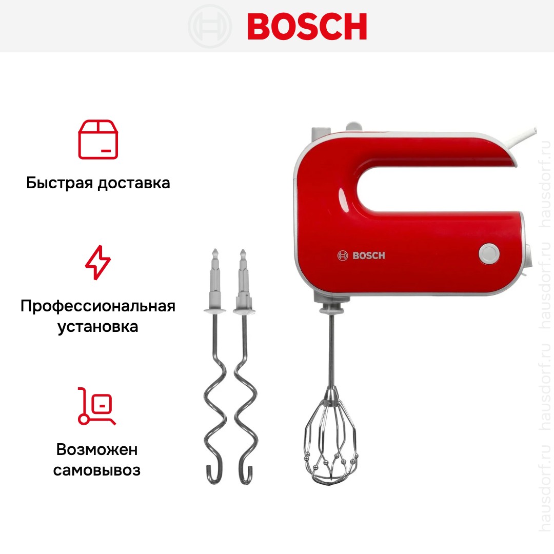 Обратите внимание на цвет миксера Бош — красный — он может стать как гармоничным дополнением кухонной обстановки, так и ярким акцентом. В комплекте с самим прибором идут дополнительные элементы: венчик для взбивания, крюки для теста.