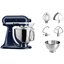 Обратите внимание на цвет миксера Китчен Эйд — чернильный синий — он может стать как гармоничным дополнением кухонной обстановки, так и ярким акцентом. В комплекте с самим прибором идут дополнительные элементы: венчик для взбивания, крюки для теста, насадка-лопатка для перемешивания, защитный обод, стальная чаша объемом 3 л, лопатка с гибким ребром.