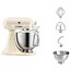 Обратите внимание на цвет миксера Китчен Эйд — кремовый — он может стать как гармоничным дополнением кухонной обстановки, так и ярким акцентом. В комплекте с самим прибором идут дополнительные элементы: венчик для взбивания, крюки для теста, насадка-лопатка для перемешивания, чаша из нержавеющей стали объемом 3 л, прозрачный защитный обод.