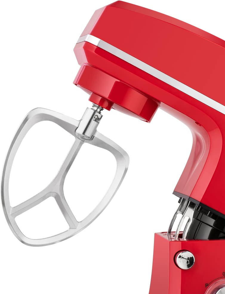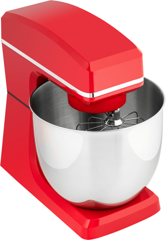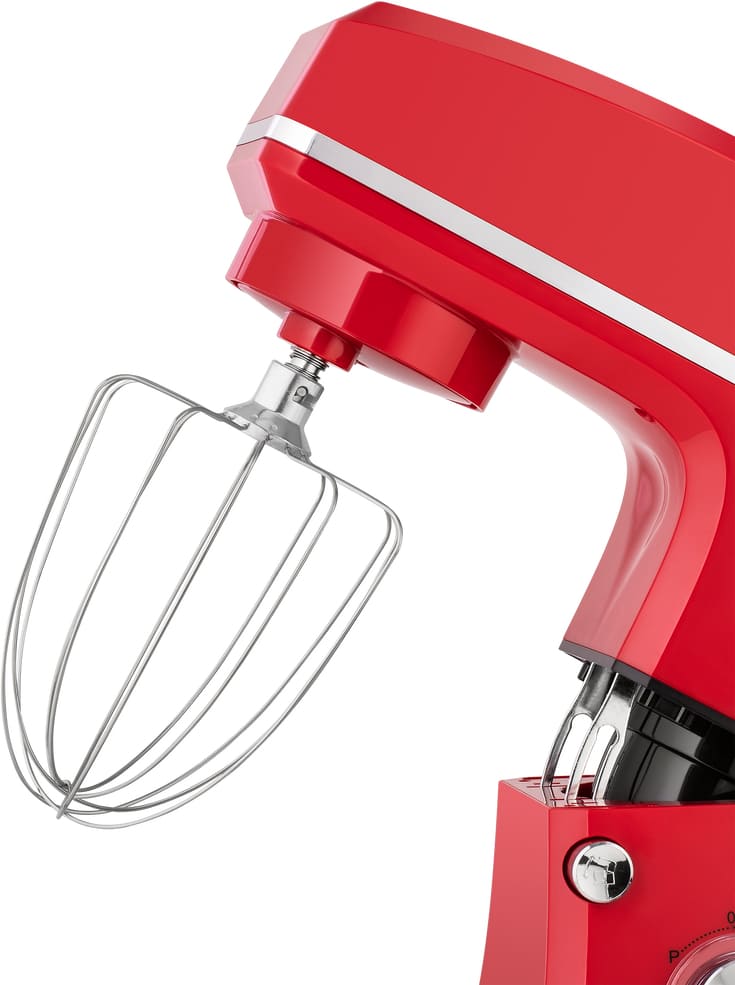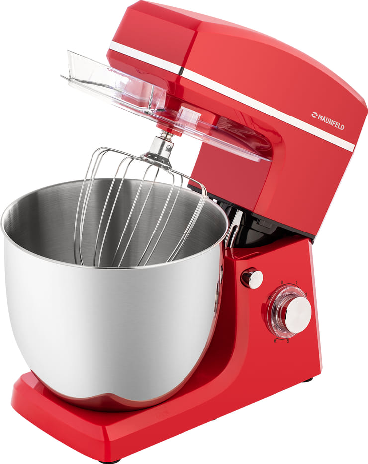 Обратите внимание на цвет миксера Маунфилд — красный — он может стать как гармоничным дополнением кухонной обстановки, так и ярким акцентом. В комплекте с самим прибором идут дополнительные элементы: венчик для взбивания, защитный обод с воронкой для засыпания продуктов, крюки для теста, насадка-лопатка для перемешивания.