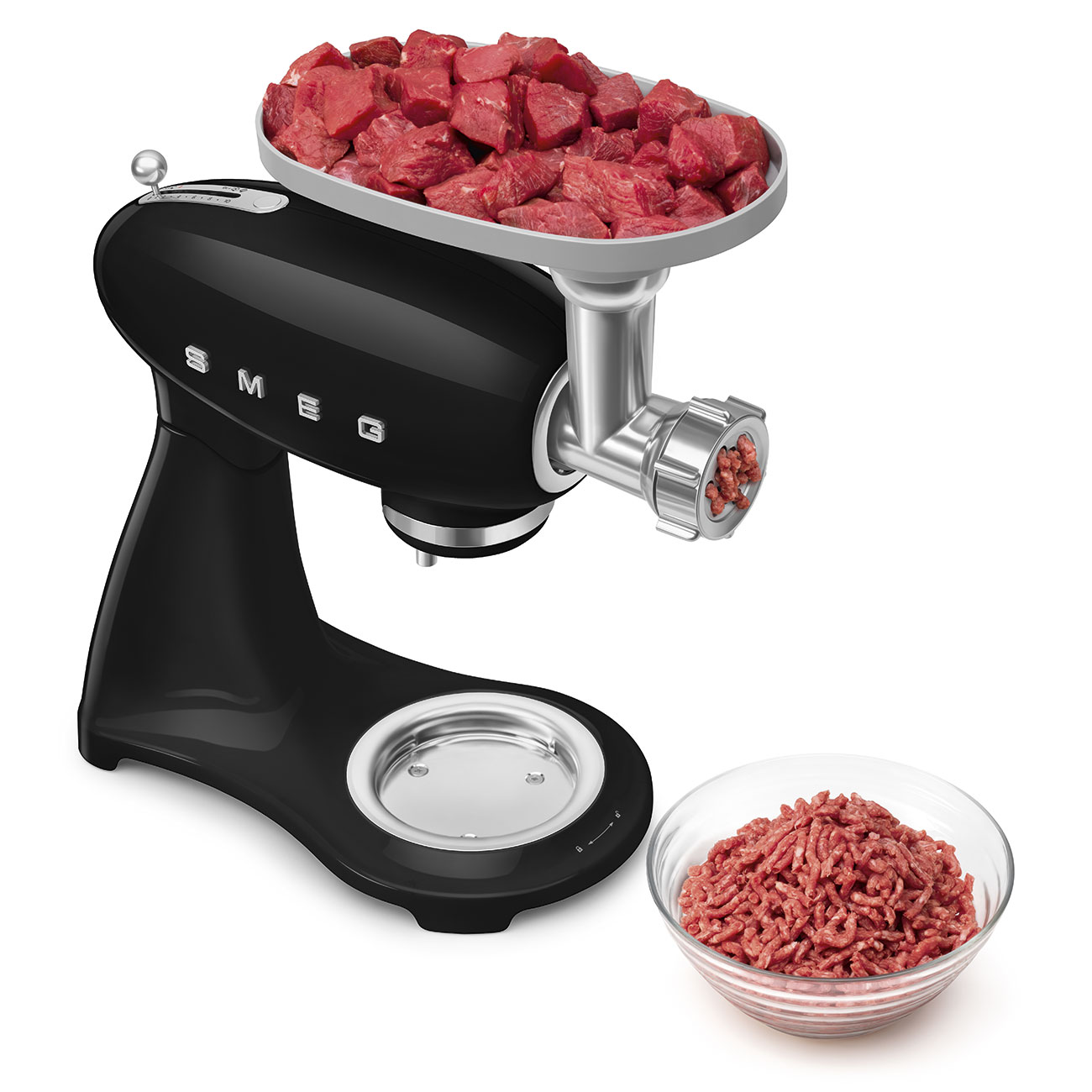 Обратите внимание на цвет миксера Смег — черный — он может стать как гармоничным дополнением кухонной обстановки, так и ярким акцентом. В комплекте с самим прибором идут дополнительные элементы: венчик для взбивания, защитная крышка на чашу, крюки для теста, лопатка с гибким ребром. Вы можете приобрести и установить другие насадки, для них создано специальное гнездо.