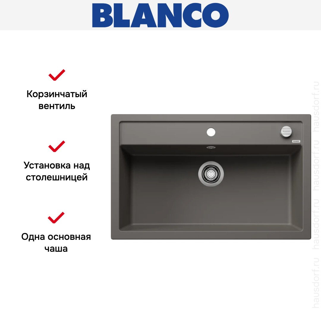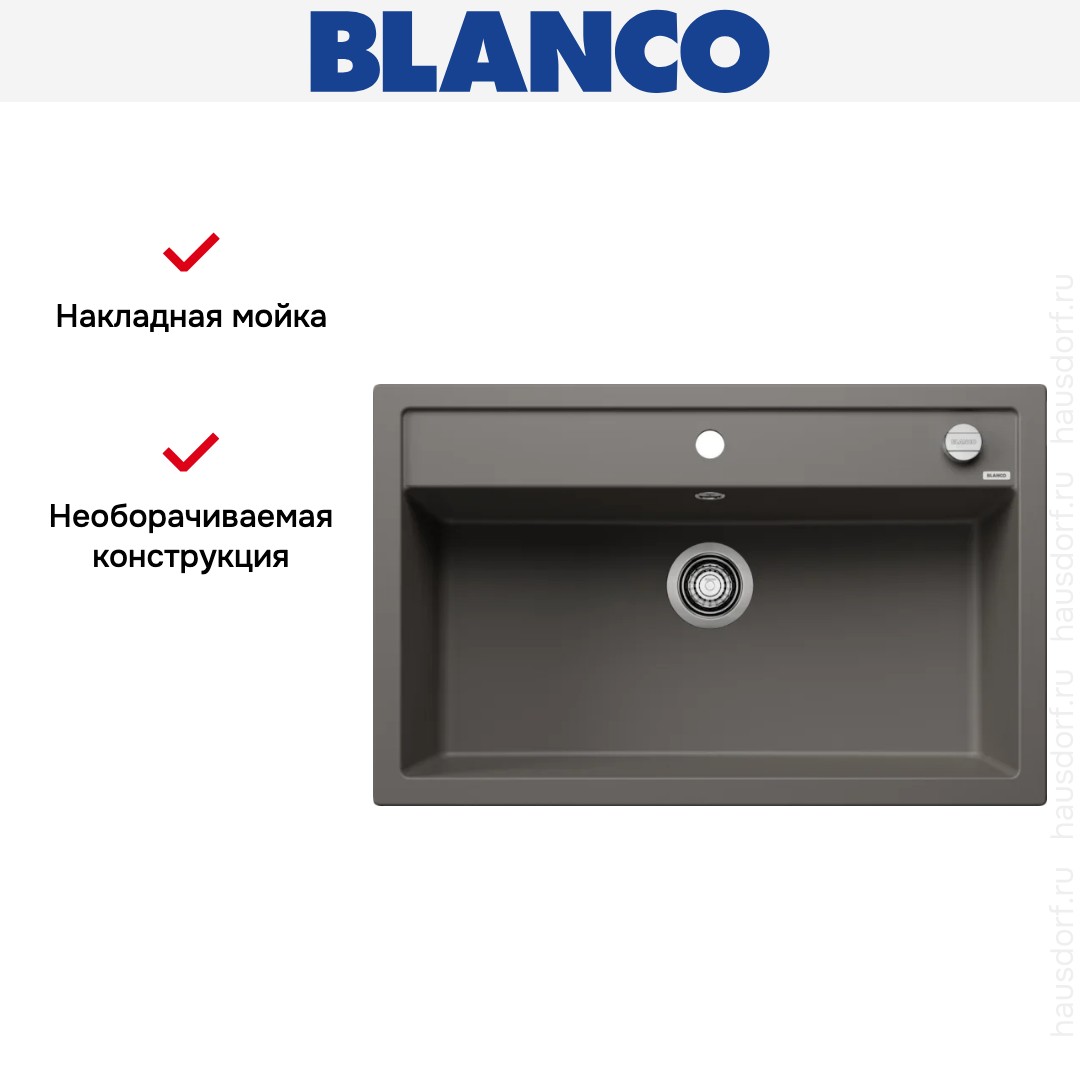 Накладная мойка Blanco — отличный выбор для тех, кто хочет создать гармоничное пространство с удобной сантехникой. простой в установке. Преимущество такой конструкции: легко подобрать практически к любой кухне и не придется демонтировать вместе с тумбой при ремонте или перестановке остальной мебели. Данная модель имеет стандартную форму, поэтому подходит большинству пользователей. Устанавливается над столешницей: это самый простой способ монтажа, зачастую с ним можно справиться даже без специалистов, главное — правильно рассчитать размеры ниши.