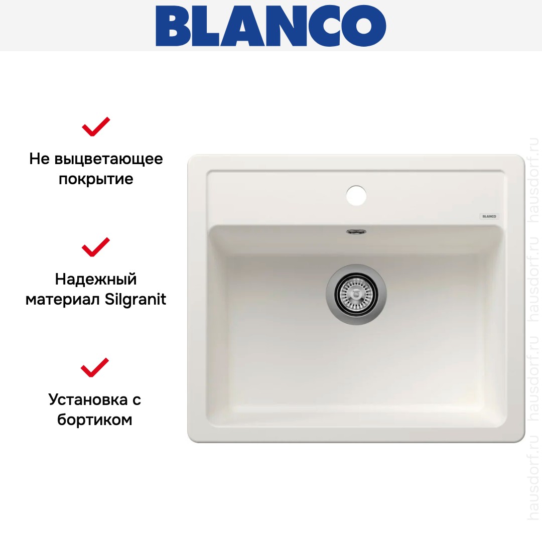 Обратите внимание на дизайнерские отличия мойки Бланко, которые помогут в создании идеальной кухни в вашем доме. Она выполнена в цвете белый. Основной материал — Silgranit, он гарантирует надежность и долгие годы службы без повреждений.