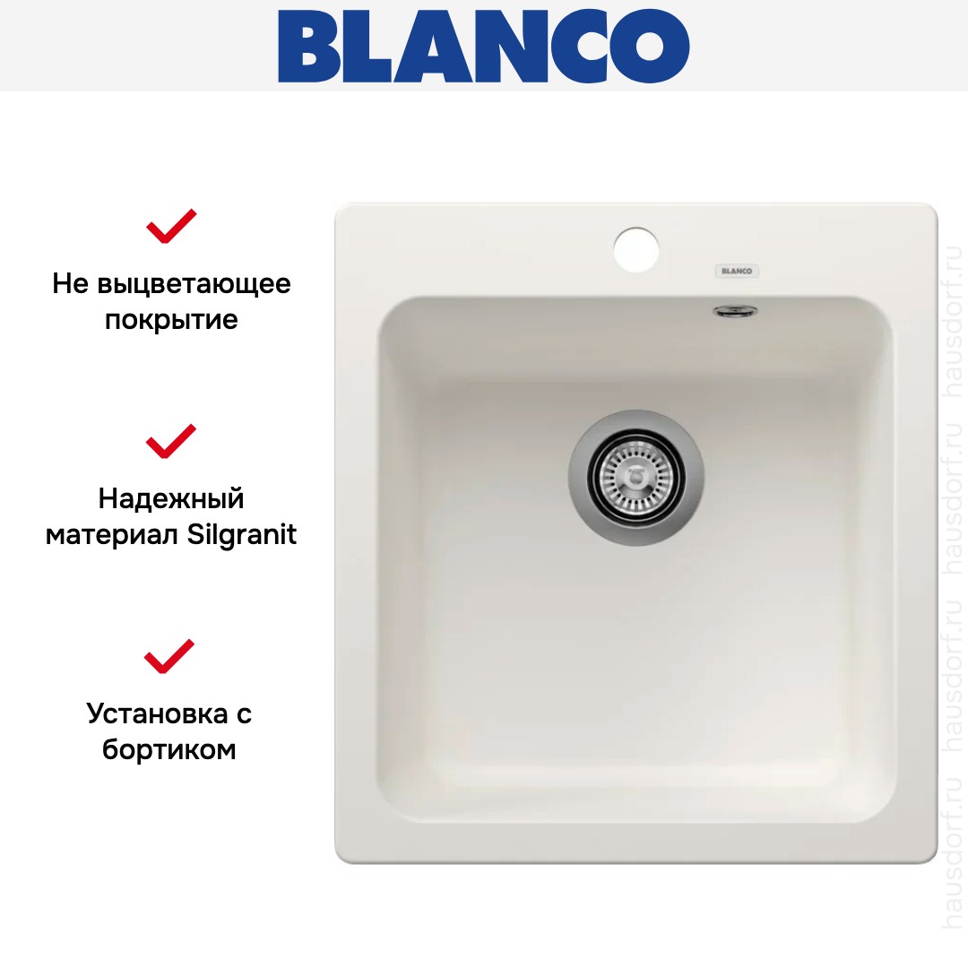 Обратите внимание на дизайнерские отличия мойки Бланко, которые помогут в создании идеальной кухни в вашем доме. Она выполнена в цвете белый. Основной материал — Silgranit, он гарантирует надежность и долгие годы службы без повреждений.