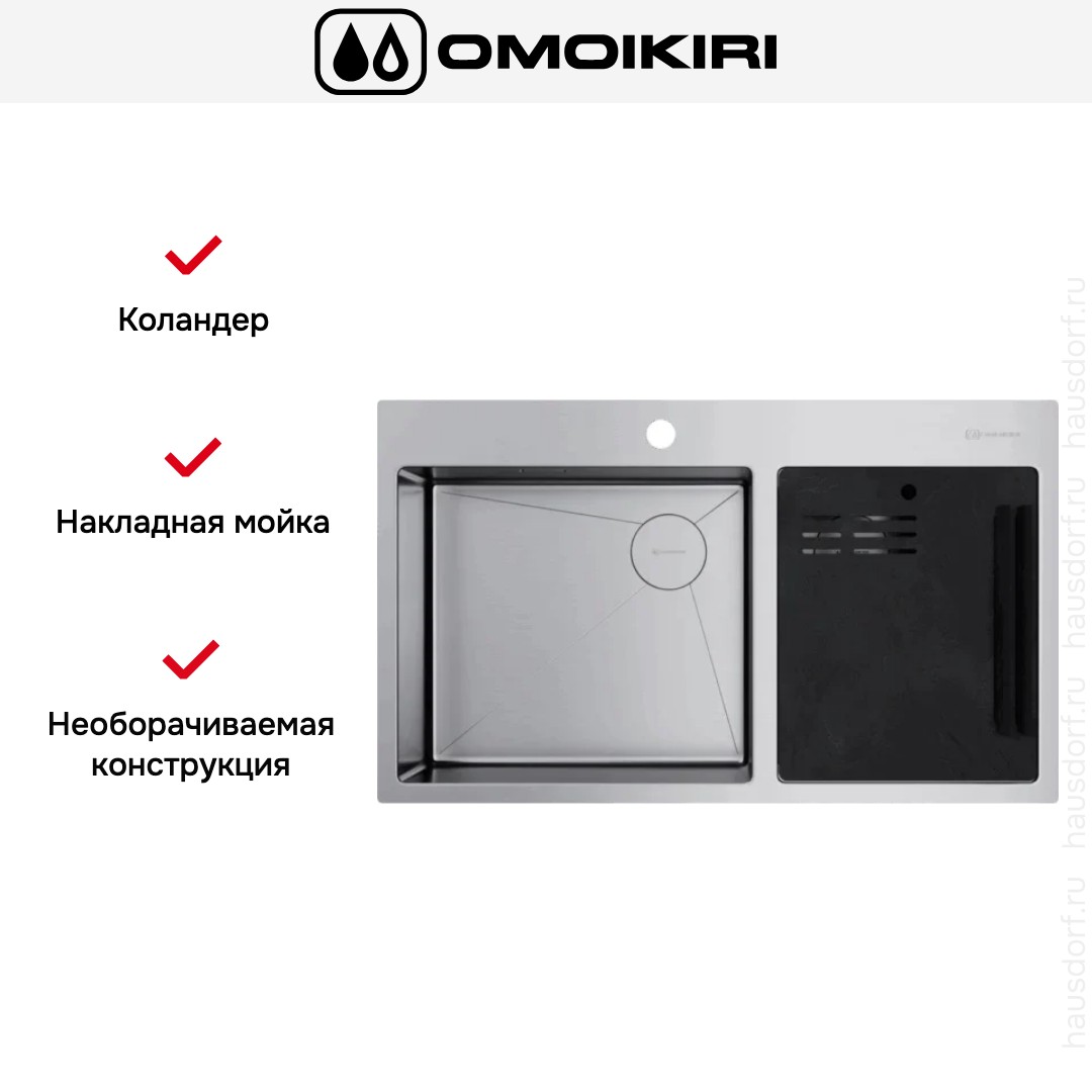 Накладная мойка Omoikiri — отличный выбор для тех, кто хочет создать гармоничное пространство с удобной сантехникой. простой в установке. Преимущество такой конструкции: легко подобрать практически к любой кухне и не придется демонтировать вместе с тумбой при ремонте или перестановке остальной мебели. Данная модель имеет стандартную форму, поэтому подходит большинству пользователей. Устанавливается над столешницей: это самый простой способ монтажа, зачастую с ним можно справиться даже без специалистов, главное — правильно рассчитать размеры ниши.
