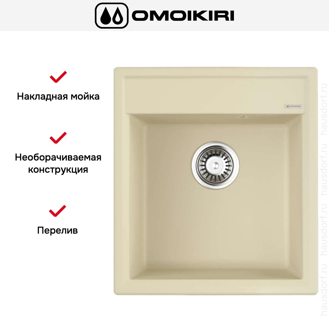 Накладная мойка Omoikiri — отличный выбор для тех, кто хочет создать гармоничное пространство с удобной сантехникой. простой в установке. Преимущество такой конструкции: легко подобрать практически к любой кухне и не придется демонтировать вместе с тумбой при ремонте или перестановке остальной мебели. Данная модель имеет стандартную форму, поэтому подходит большинству пользователей. Устанавливается над столешницей: это самый простой способ монтажа, зачастую с ним можно справиться даже без специалистов, главное — правильно рассчитать размеры ниши.