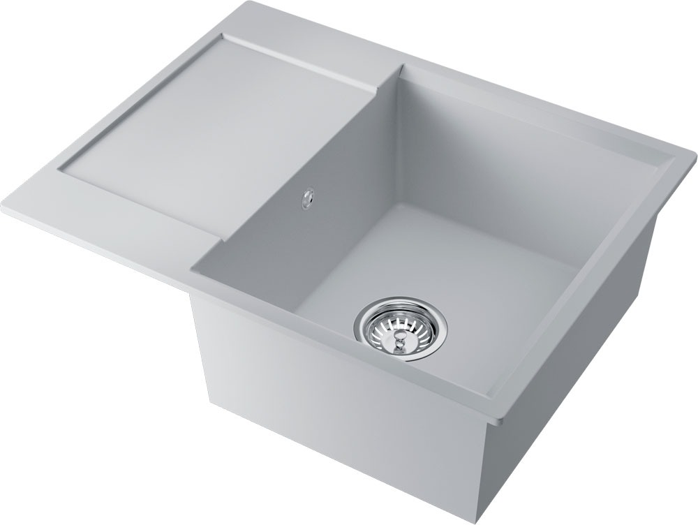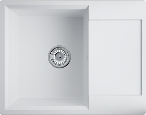 Прямоугольная накладная мойка белого цвета выглядит нарядно и чисто; габариты 65×51 см формируют удобную рабочую зону у стены или у окна. Плоскость с крылом образует единый контур, кромки ровные, линии геометричные — такой облик легко поддерживает визуальный порядок на столешнице.