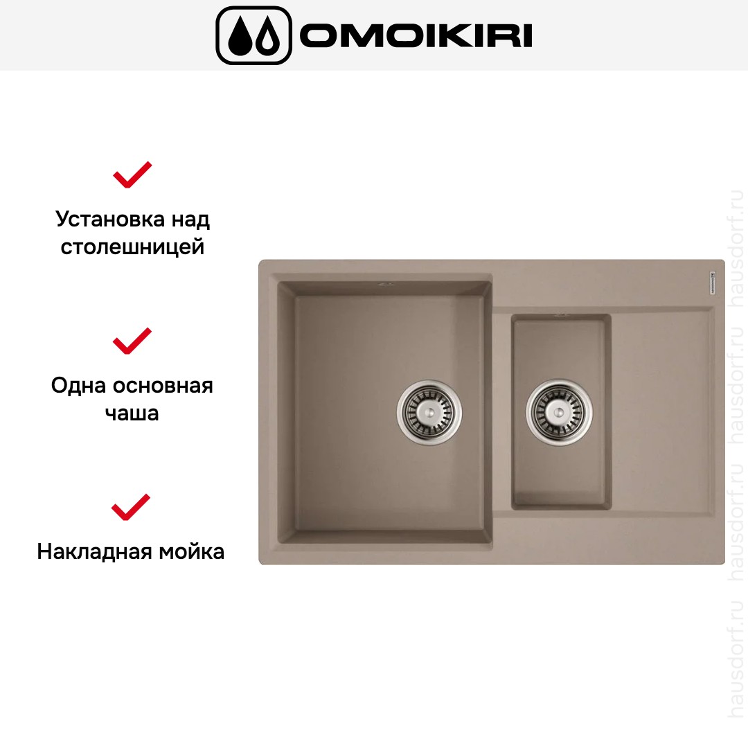 Накладная мойка Omoikiri — отличный выбор для тех, кто хочет создать гармоничное пространство с удобной сантехникой. простой в установке. Преимущество такой конструкции: легко подобрать практически к любой кухне и не придется демонтировать вместе с тумбой при ремонте или перестановке остальной мебели. Данная модель имеет стандартную форму, поэтому подходит большинству пользователей. Устанавливается над столешницей: это самый простой способ монтажа, зачастую с ним можно справиться даже без специалистов, главное — правильно рассчитать размеры ниши.