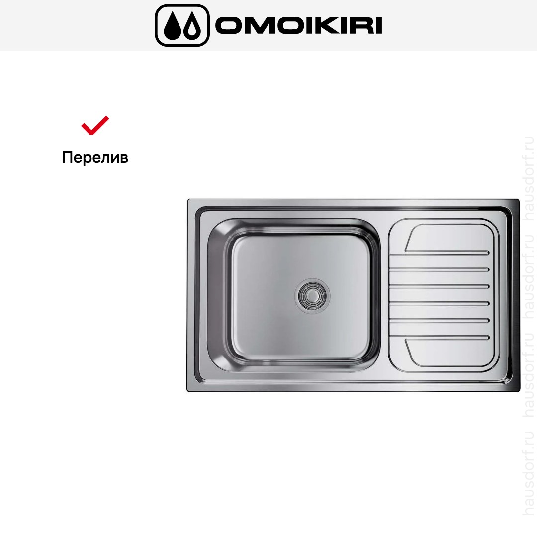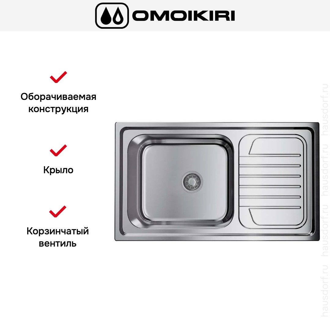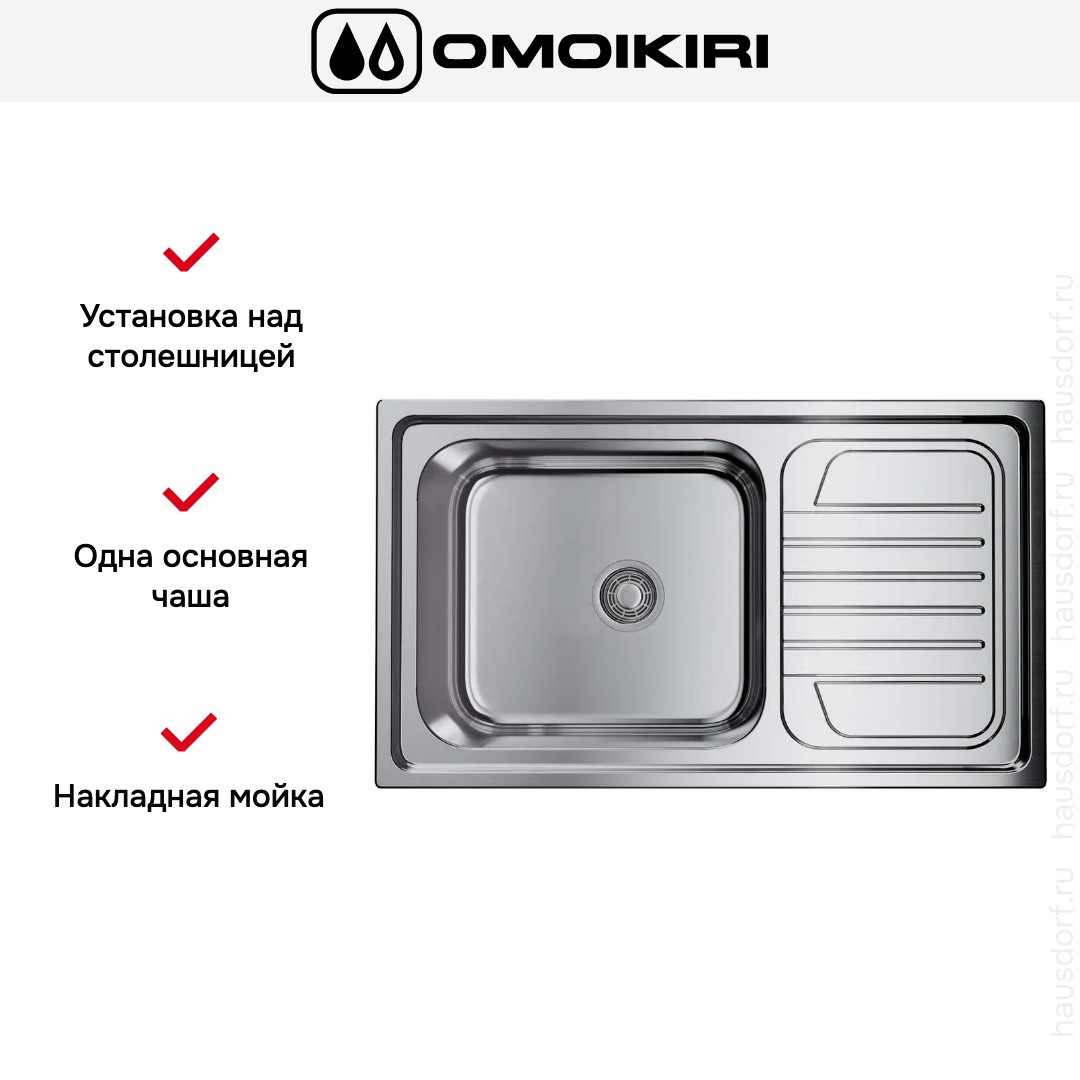 Накладная мойка Omoikiri — отличный выбор для тех, кто хочет создать гармоничное пространство с удобной сантехникой. простой в установке. Преимущество такой конструкции: легко подобрать практически к любой кухне и не придется демонтировать вместе с тумбой при ремонте или перестановке остальной мебели. Данная модель имеет стандартную форму, поэтому подходит большинству пользователей. Устанавливается над столешницей: это самый простой способ монтажа, зачастую с ним можно справиться даже без специалистов, главное — правильно рассчитать размеры ниши.