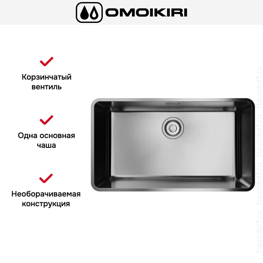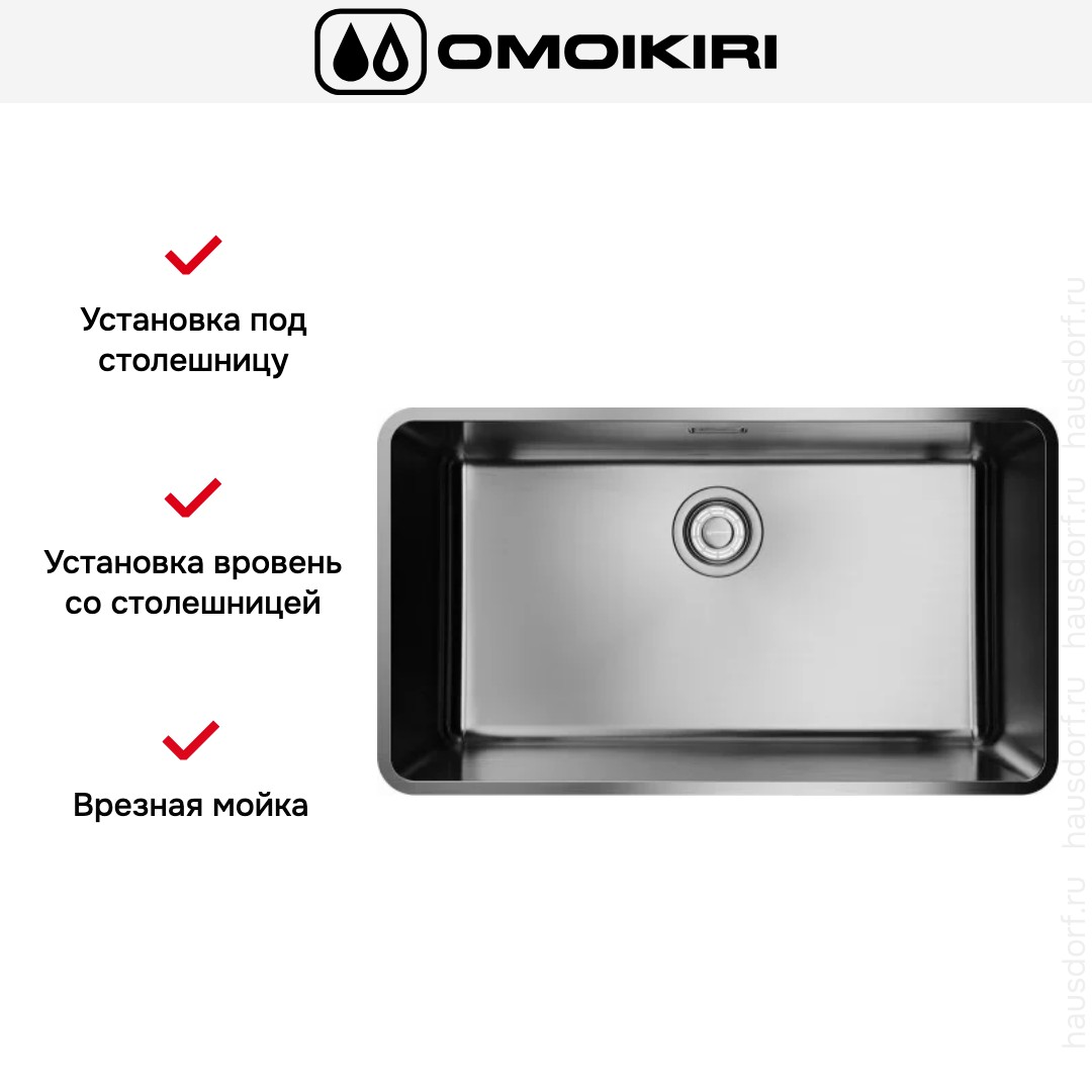 Врезная мойка Omoikiri — отличный выбор для тех, кто хочет создать гармоничное кухонное пространство с полностью вписывающейся в него сантехникой. Преимущество такой конструкции — плотное прилегание к столешнице, так как вырез подбирается индивидуально под габариты модели. Под стыки не попадает вода, поэтому срок службы значительно увеличивается, пользоваться ей удобно и приятно. Данная модель имеет стандартную форму, поэтому подходит большинству пользователей. Устанавливается вровень со столешницей, благодаря чему не остается стыков, в которых копились бы загрязнения. Устанавливается под столешницу, благодаря чему не остается стыков, в которых копились бы загрязнения, а также увеличивается рабочая глубина.