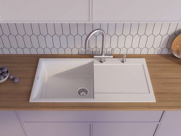 Интегрированная — встраиваемая модель из того же материала, что и столешница. Благодаря этому она выглядит как часть мебели.