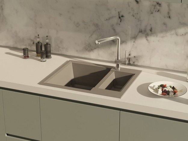 Интегрированная — встраиваемая модель из того же материала, что и столешница. Благодаря этому она выглядит как часть мебели.