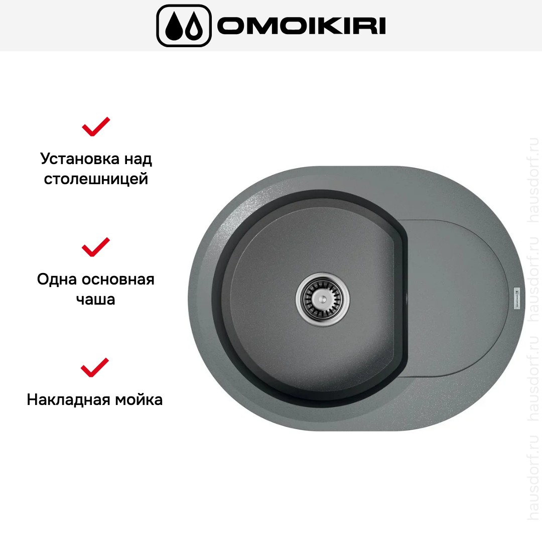 Накладная мойка Omoikiri — отличный выбор для тех, кто хочет создать гармоничное пространство с удобной сантехникой. простой в установке. Преимущество такой конструкции: легко подобрать практически к любой кухне и не придется демонтировать вместе с тумбой при ремонте или перестановке остальной мебели. Данная модель имеет скругленный контур, поэтому выбор тумбочки для нее потребует дополнительного внимания. Устанавливается над столешницей: это самый простой способ монтажа, зачастую с ним можно справиться даже без специалистов, главное — правильно рассчитать размеры ниши.