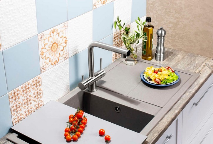 вровень со столешницей — создается ощущение бесшовного пространства, а если мойка сделана из того же материала, то и единого дизайна;
