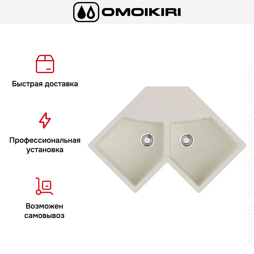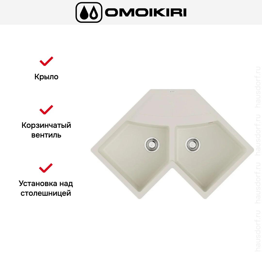 Накладная мойка Omoikiri — отличный выбор для тех, кто хочет создать гармоничное пространство с удобной сантехникой. простой в установке. Преимущество такой конструкции: легко подобрать практически к любой кухне и не придется демонтировать вместе с тумбой при ремонте или перестановке остальной мебели. Данная модель подойдет владельцам маленькой или нестандартной кухни; благодаря угловому размещению она освобождает пространство по бокам для работы или размещения кухонной техники. Устанавливается над столешницей: это самый простой способ монтажа, зачастую с ним можно справиться даже без специалистов, главное — правильно рассчитать размеры ниши.
